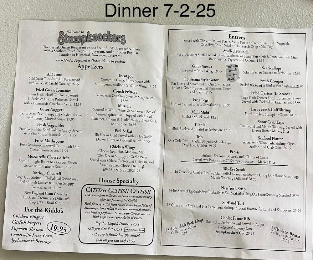 Stumpknockers offers a diverse menu centered around local seafood and traditional Southern comfort food. Diners can explore a variety of appetizers, including gator nuggets and fried mushrooms that set the stage for a fantastic meal. The house specialties shine, with the regular catfish dinner and all-you-can-eat options drawing rave reviews.